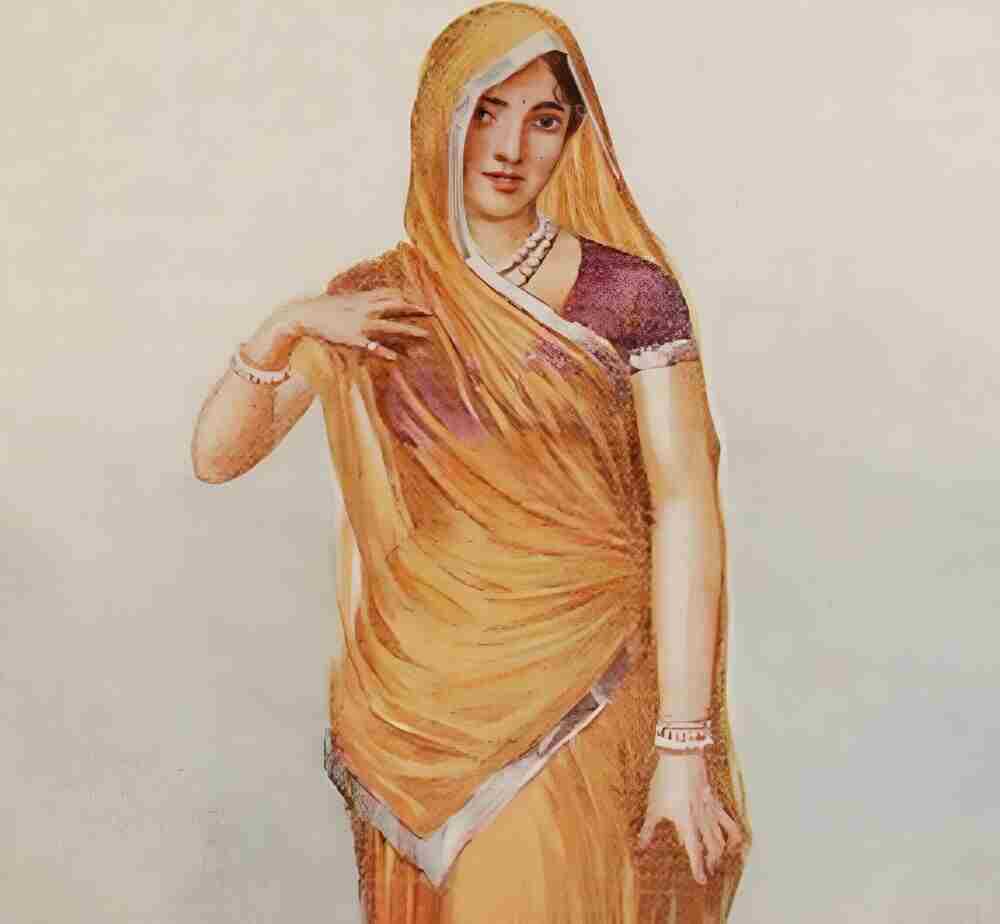 سمعت أنجو كلام أبيها، فبدأت تتزين بأفضل ما لديها: ارتدت تنورة أرجوانية فاخرة مطرزة بقطع المرايا لجلب الحظ، وشالاً قرمزيًا كعروس لتغطية رأسها. سرحت شعرها وضفرته بطريقة العرائس، وملأت فراق رأسها الـسيندور الأحمر القاني، مثل العرائس الجُدد.