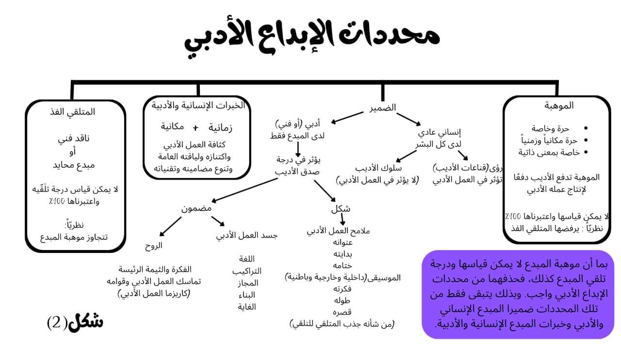 ومِن وجهة نظرنا، فالإبداعُ الأدبيُّ يتكوَّنُ مِن أربعةِ عناصِرَ رئيسَةٍ، كما في شكل(2).
