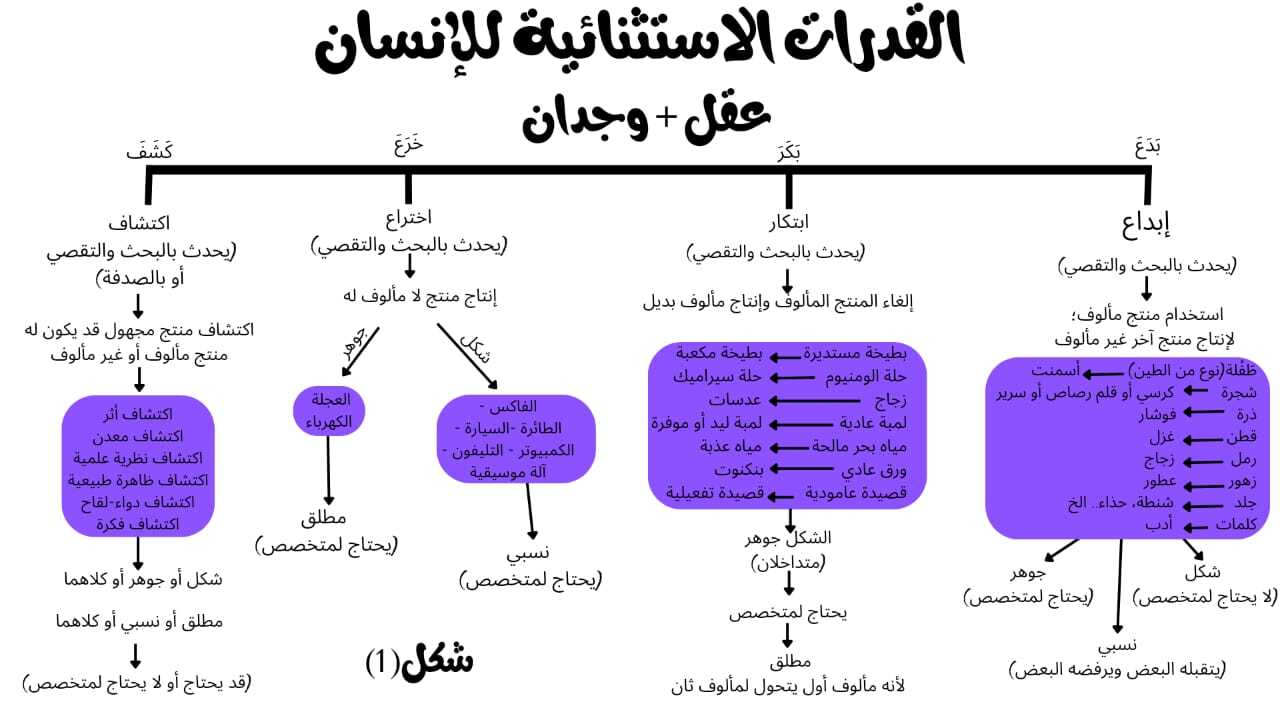 لكني أرجو من المتلقي الموقَّرِ أن يسمحَ لي أوَّلًا بنقلِ بعضِ المفاهيمِ إليه، باعتبارِها الأُسُسَ التي نَبني عليها هذه الرؤيةَ المتواضعة. من خلال بعض الخرائط الاسترشادية المُبَسِّطةِ لي قبل أن تكونَ مُبَسِّطةً للقارئِ الفذ. فالقدراتُ الاستثنائيةُ للإنسان، لعقلهِ ووجدانه، تتمثَّلُ في الإبداعِ، والابتكارِ، والاختراع، والاكتشاف. وكما هو موضَّح بالشكل (1)، فالإبداعُ هو استخدامُ منتَجٍ مألوفٍ لعملِ منتَجٍ غيرِ مألوف (شجرة تُحَوَّلُ لكرسِيٍّ مثلًا)، وهو ينقسم إلى قسمين: شكل وجوهر. والشكلُ فيه لا يحتاجُ لمتخصص. والشكلُ هو الملامحُ الظاهريةُ للمُنتَجِ الجديدِ غيرِ المألوف، والذي لا يحتاجُ إلى متخصص. فالكرسيُّ قد يكونُ بأربعِ أرجلٍ أو بثلاثٍ أو باثنتَين، وقد يكونُ بِظَهرٍ أو بدونِ ظَهر. وقد يكون لونُه أبيضَ أو أخضر. لكن الجوهر، وهو المقوِّماتُ الباطنيةُ للمُنتَجِ المذكور، يحتاجُ إلى اختصاصِيٍّ ليُقِرَّ إنْ كان ذلك الكرسيُّ متينًا في صُنعِهِ، وفي نوعِيَّةِ خشبِهِ، وفي نوعيَّةِ دِهاناتِه وعمرِها، وفي عمره الافتراضيِّ كذلك.